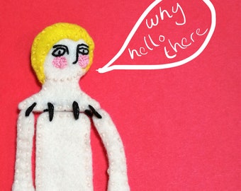 A handmade doll with a yellow yarn head and a white yarn body is standing on a red background. The doll has black yarn hair and is wearing a white yarn dress with black yarn straps. The doll is holding a speech bubble with the text 'Why hello there' in a cursive, childlike font. | Rag doll felt brooch | b61b5f46c71436bdd70f569a7a99a209d4b53f7f0d4ba223bec7c13cd1270948 | 001229744313 | 0 | 0 | 54 | 4 | 0 | 0 | |