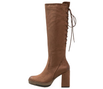 A pair of brown high-heeled boots with a pointed toe and a thick, ribbed shaft. The boots have a stacked heel and a brown leather upper. The laces are tied in a bow at the top of the shaft. | Plateaustiefel - cognac antic | 77a04be91b7eac5e0a8b1e4203a121d30dcd8893e9058fb9311839d44de00aa2 | 001229744748 | 0 | 0 | 39 | 4 | 0 | 0 | |