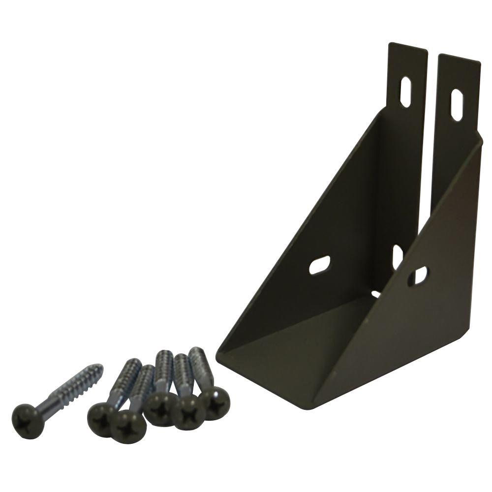 A black metal bracket with two holes is displayed on a white background. Below the bracket, there are ten screws of various sizes, with the largest one on the left and the smallest one on the right. | 1-1/2 in. x 3-3/4 in. Gray Composite Fence Rail Bracket with Screw | e82108897c905d8c6b1a338b867a7b7fe1c8721df402a23129b606180652e435 | 001229744796 | 0 | 0 | 37 | 12 | 0 | 0 | |