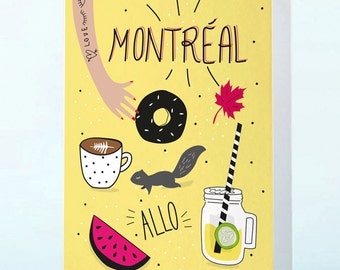 A stylized illustration of a person's hand holding a cup with the word 'Montreal' written above it. The illustration includes various food and drink items such as a donut, a coffee cup, a glass of lemonade, a strawberry, a watermelon slice, and a squirrel. The background is a plain light color with a few scattered dots and a heart with the word 'Love' written inside it. | Montreal's card | a7b2597315cf9dab4ae36218bafce35295fbe6843a2614c86254d007ff068a7c | 001229744775 | 0 | 0 | 66 | 2 | 0 | 0 | |