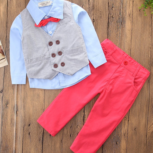 A child's outfit consisting of a blue shirt with a red bow tie, a grey vest with brown buttons, and red pants is laid out on a wooden surface. | Boys 4-Piece Outfits Blue Long Sleeves Shirt Match Vest and Red Pant Dressy Up Clothes | 0286079605e6650b1bd612e39b9531df4b0f2ea6ad21ee302fe82accc08d7a2b | 001229744712 | 0 | 0 | 29 | 15 | 0 | 0 | |