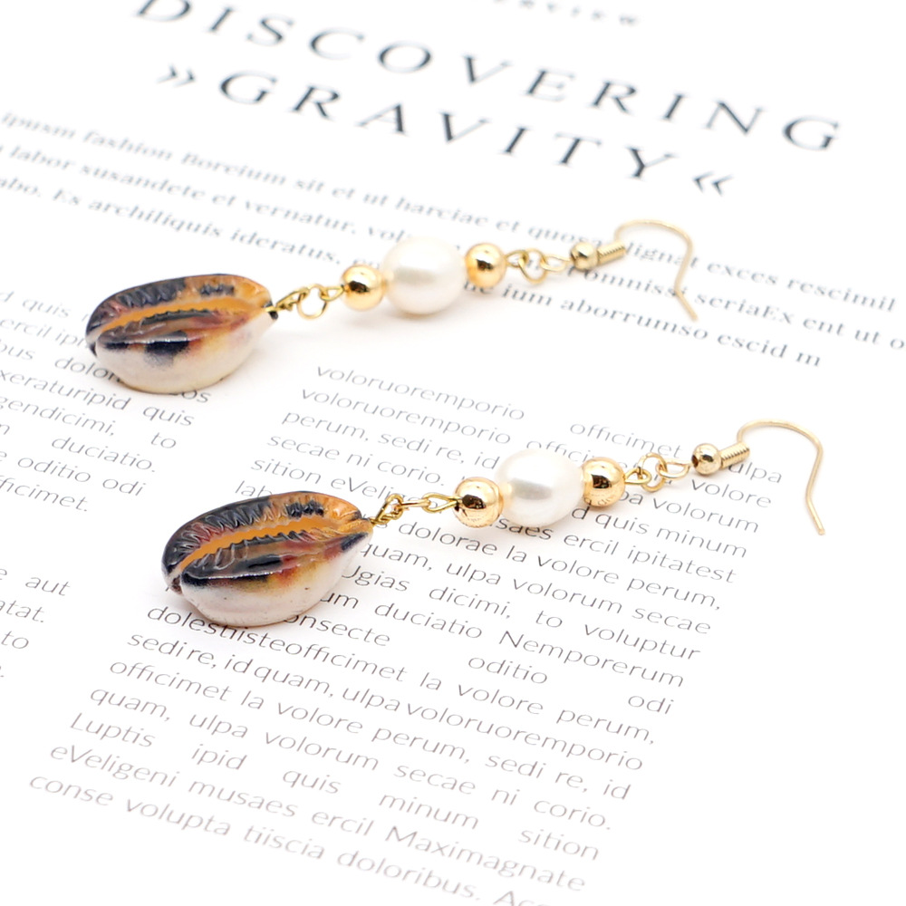 A pair of gold earrings with white pearls and a shell design is displayed on a white background. The earrings are positioned on the left side of the image, and there is a book with text on the right side. The text on the book reads 'DISCOVERING GRAVITY'. | creative simple earringspearl fashion trendy leopard natural shell long earrings handmade jewelry wholesale nihaojewelry NHGW228718 | 1e203b75fe3156e6c4fefa41721ef32953ab7334b2b0f1f8ffba01299ae5363b | 001229745149 | 0 | 0 | 48 | 15 | 0 | 0 | |