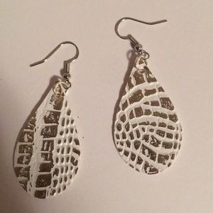 A pair of white earrings with a textured design resembling a cracked surface, possibly resembling a cracked sidewalk or pavement, is displayed against a white background. | Jewelry - Faux Leather Earrings | cf3f9e1464041efff513474cced0e5e694e7fcc110d4b1d30c08d16ce7c37030 | 001229745257 | 0 | 0 | 26 | 5 | 0 | 0 | |