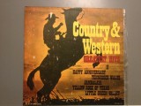 A vintage-style poster with a cowboy riding a bucking bronco in the center. The poster has a warm color palette with shades of orange, yellow, and brown. The text 'COUNTRY & WESTERN' is prominently displayed at the top in large, bold letters. Below the cowboy, there is a list of events with dates and times, such as 'BIRTHDAY ANNIVERSARY', 'JANUARY 1ST', 'TEJANO DAY', 'LITTLE RYDER', and 'LITTLE RODEO'. The poster has a worn and aged appearance, with some areas of the paper showing signs of | COUNTRY & WESTERN - GREATEST HITS (1984 /ELECTRECORD ) - VINIL/VINYL/IMPECABIL | 54ad03bf6e8c892a1c5061e63257d9bd8228e496c1a4ec297d812189121adfb6 | 001229745141 | 0 | 0 | 85 | 11 | 0 | 0 | |
