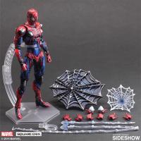 A detailed action figure of Spider-Man is displayed on a black background. The figure is posed with one leg forward and arms slightly bent. It is wearing a red and blue costume with a spider emblem on the chest. The figure is accompanied by a variety of accessories, including a web shooter, a web, a shield, and a spider web. The web shooter is attached to the figure's arm, and the web is draped over the figure and the accessories. The shield is positioned to the left of the figure, and the spider web is spread out in the background. The figure is labeled 'MARVEL EXCLUSIVE' and 'SIDE SHOW | Gallery Image of Spider-Man Variant Collectible Figure | 84669ca064e3dae30e6986a47c9a54ad8f87f5a67c1c69bf7ad7b8850ee5b444 | 001229745366 | 0 | 0 | 109 | 7 | 0 | 0 | |