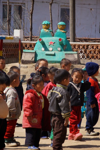 A group of children wearing winter clothing are standing in a line on a dirt ground. They are facing a large, green, toy-like structure with a red star on it. The structure has a smiling face and is surrounded by a brick wall. The children are wearing various colors of jackets, with some wearing red, blue, and green. They are all wearing pants, and some have hats on their heads. The ground is dry and brown, and there are trees in the background. | Dongbong Co-Operative Farm, Hamhung, North Korea | 75943e8bebf2449a7b031ccef440ad90c8337ada13c4b86301ab339e5d8db596 | 001229746048 | 0 | 0 | 83 | 6 | 0 | 0 | |