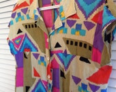 A colorful, patterned shirt with a mix of geometric shapes and vibrant colors such as red, blue, yellow, and purple is displayed on a hanger against a white background. The shirt has a relaxed fit and appears to be made of a lightweight material. | 90s Cotton Gauze, Ikat Blouse, Crop, Oversize, New Wave | a113945a530488b2606b5b513137b1afef81c69d4997040a0826f962dc698ae8 | 001229745821 | 0 | 0 | 44 | 9 | 0 | 0 | |