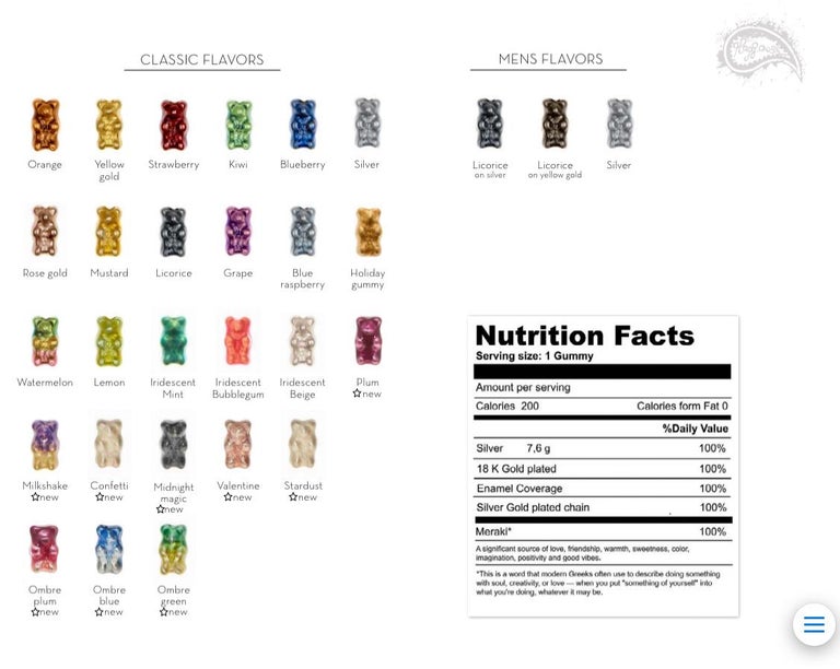 A detailed illustration of various flavors of gummy bears, each with a unique color and flavor name, arranged in a grid-like pattern. The illustration is accompanied by a nutrition facts table that lists the ingredients, nutritional information, and serving size for each flavor. The table is presented in a modern, clean design with clear headings and concise information. | Contemporary Drop Earrings Gummy Bears Grape Gift 18 Karat Silver Gold-Plated Greek Jewelry For Sale | f8d42845535014b4fd1b2f6abcc9052a34fffe4272208bc7e01079f94bbb46b9 | 001229746096 | 0 | 0 | 58 | 15 | 0 | 0 | |