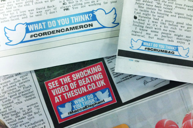 A newspaper with several articles and advertisements is spread out on a table. The top left corner features a blue and white Twitter bird sticker with the text 'What do you think? Corden Cameron #CordenCamron'. Below it, there is a similar sticker with the text 'What do you think? SCRUNMBAG #SCRUNMBAG'. The bottom left corner has a sticker with the text 'What do you think? @TheSunDoYouThink?'. The bottom right corner has a sticker with the text 'What do you think? @TheSunDoYouThink?'. The newspaper is filled with various articles and advertisements | The Sun: to print dedicated hashtags alongside its news stories | ca03babbb2eaa9264fa8bf6c773f07a0845aeb315a8a820dfed728a7d4b2b8da | 001229746141 | 0 | 0 | 90 | 10 | 0 | 0 | |