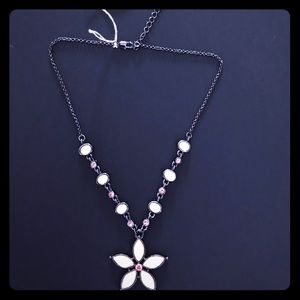 A close-up of a silver necklace with a large, ornate flower pendant featuring pink and white gemstones. The necklace has a chain with alternating round and oval white beads, and a clasp at the top. The background is a dark blue gradient. | Park Lane Ashley Necklace | f001ff69c60b31609c7124ff3b320d289aee510cc851fdbc3887a42066544a19 | 001229746102 | 0 | 0 | 42 | 4 | 0 | 0 | |