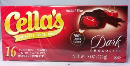 A box of Cella's Dark Chocolate Cherries is displayed. The box is red with a yellow border and the words 'CELLA'S' in yellow. The chocolate cherries are depicted on the front of the box, with a prominent cherry in the center. The box is labeled '16 DELICIOUS CHERRIES COVERED WITH REAL CHOCOLATE' and 'NET WT 16 OZ (450g)'. | Cella's Dark Chocolate Covered Cherries, 16 Count | 3e5c94c5f98b6a925a96a23b5e5cdbe96dd471ddc1c53ca541959d79f50b5557 | 001229746135 | 0 | 0 | 58 | 7 | 0 | 0 | |