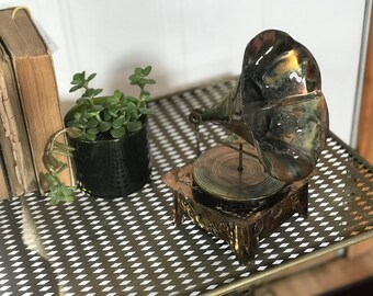 A vintage gramophone with a clear glass horn sits on a black and white checkered table. Next to it, there is a small potted plant with green leaves. In the background, there are several old books stacked on a shelf. | Fabulous Mixed Metal Vintage Sankyo Japan Music Gramophone Plays Lara's Theme 1970s/1980s Music Box Phonograph | 3d52feeb9ae1f72b758be697c199337c67775144d2bb02f6334a44ba22d95087 | 001229745866 | 0 | 0 | 40 | 15 | 0 | 0 | |