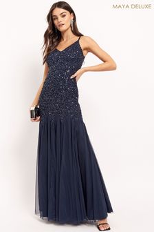 A woman is wearing a blue dress with a fitted bodice and a flared skirt. The dress has a sparkling texture and is paired with black sandals. She is holding a clutch in her left hand and has a relaxed pose with her right hand on her hip. | Maya Navy Sequin Fishtail Maxi Dress | 939a65b7a7db837a074e934c1f262b9007815fadc753e7639ed238646470ecd5 | 001229746148 | 0 | 0 | 48 | 6 | 0 | 0 | |