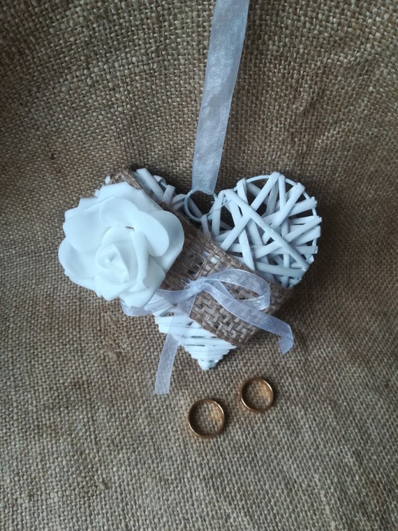 A white ceramic rose with a beige ribbon tied around it is placed on a burlap surface. The rose is accompanied by a pair of gold rings, one on each side of the rose. The burlap surface has a textured appearance with a warm tone. | Rustic Ring Pillow Wedding ring pillow Ring bearer pillow alternative Rattan heart for wedding rings Wedding Accessory | 7883abe1e199a3449f3fa14596700ba28d5af613df45e565580b74f4bd760000 | 001229746303 | 0 | 0 | 45 | 17 | 0 | 0 | |