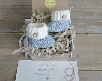 A pair of knitted baby shoes with a heart-shaped button on the front is placed in a cardboard box filled with crinkled paper. The shoes are white with a blue trim and have a small brown button on the front. The box is on a wooden surface, and there is a card with a message that reads 'One little heart, two tiny feet... We are having a baby!' with a heart and a baby footprint design. | Pregnancy Announcement, Grandparent, Daddy Reveal, BOOTIES IN A BOX\xc2\xae, Ribbed Cuffs with Wood Buttons, Baby Reveal Box | ffbf59eff94208d7163c3e12b8fe408b2d17a5d0b4bae13d948bcf5b4d6db407 | 001229746329 | 0 | 0 | 76 | 17 | 0 | 0 | |