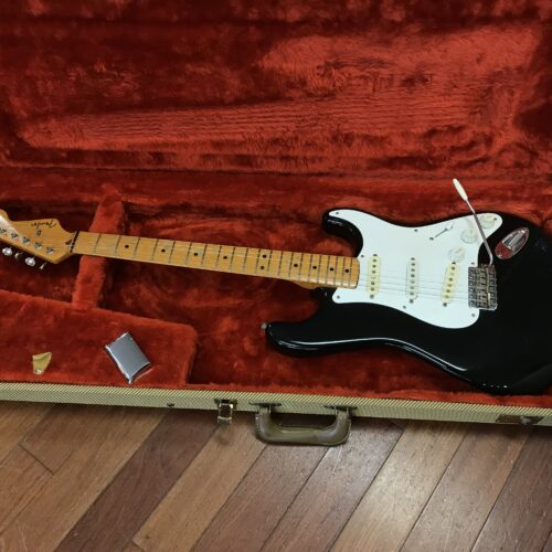A black electric guitar with a white pickguard is lying inside an open guitar case. The case is placed on a wooden floor, and the interior of the case is lined with red velvet. There are a few guitar picks and a small metal object on the floor next to the case. | 1983 Fender 57 reissue Fullerton Stratocaster | b3cfa7361e0a9018304228db883fde916a48bc429b3f2c6d4a667eba276a6069 | 001229746319 | 0 | 0 | 52 | 6 | 0 | 0 | |