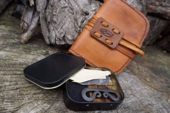 A brown leather wallet with a metal snap closure is placed on a wooden surface next to a black metal tin with a lid, which is open and contains a piece of paper and a metal object. | Fire leather 1oz tinderbox kit with pouch | eb9322f8df0447973c24c2faa55d0e23f81e93ab8f92ed5bd8006560f084c7af | 001229746223 | 0 | 0 | 37 | 7 | 0 | 0 | |