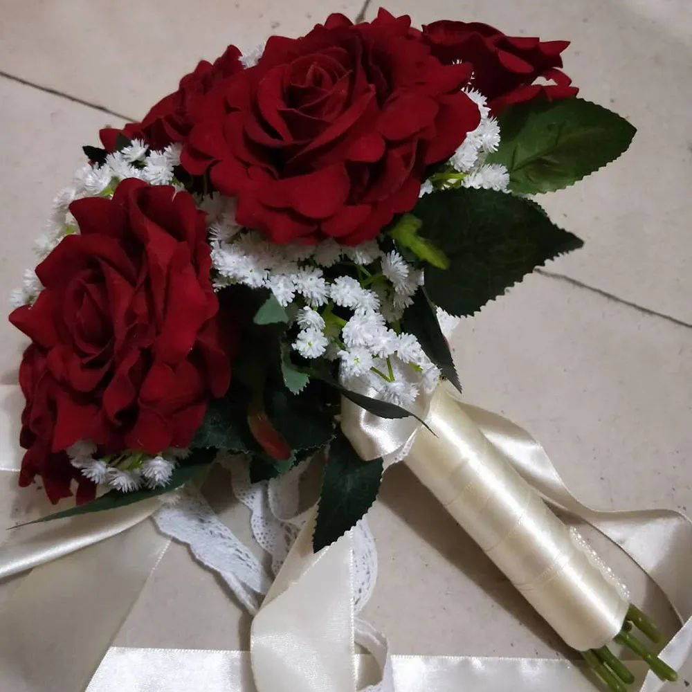 A bouquet of red roses with white baby's breath is arranged in a clear glass vase. The roses are in full bloom with vibrant red petals, and the baby's breath adds a delicate, airy texture to the arrangement. The vase is placed on a surface with a subtle pattern, and the bouquet is tied with a white ribbon that drapes elegantly over the edge of the vase. | 2018 Real Images Artificial Red Rose Wedding Bouquet Beautiful | 44c6d7adbfb08d6b6b0230b2306183c761a11fd8f78af4130518011fea9d26da | 001229746206 | 0 | 0 | 67 | 9 | 0 | 0 | |