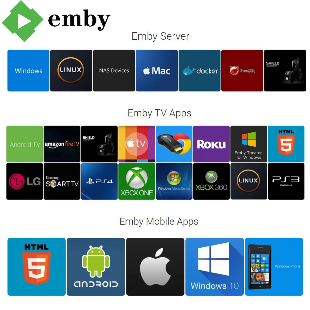 A collection of various apps and software icons is displayed in a grid layout. The top row shows icons for 'EMBY', 'EMBY Server', 'Windows', 'Linux', 'NAS', 'Mac', 'Docker', and 'Roku'. The second row features icons for 'TV', 'Amazon Fire TV', 'Apple TV', 'Google TV', 'Roku', 'Linux', 'Windows', and 'PS3'. The third row includes icons for 'Emby TV Apps', 'Mobile Apps', 'Windows', 'Linux', 'Mac', 'Docker', 'Roku', and 'PS3'. The fourth | 1 Year Emby Account Spanish Version With DAZN HBO 4K UHD For Smart TV Box Android Mobile Smartphone Windows PC PK PLEX Spain | 732902727e9946f97864272cea804e0f4dc8ebafdb12c60be8e8a73844b2e976 | 001229746385 | 0 | 0 | 69 | 23 | 0 | 0 | |