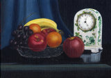 A still life painting featuring a bowl filled with various fruits such as bananas, grapes, apples, and oranges, placed on a dark surface. To the right of the bowl, there is a vintage clock with a floral pattern on its face. The background consists of a dark blue curtain partially covering the scene. | Clock and Fruit | 399e697795f6d2e61e12e16b44feb2b5712a85b5f6b60573a35f19197f3daf97 | 001229746464 | 0 | 0 | 53 | 3 | 0 | 0 | |