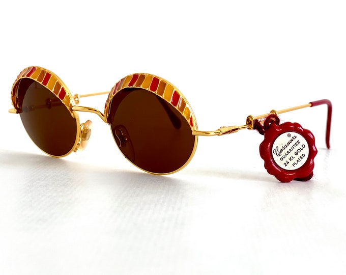 A pair of round, gold-framed sunglasses with brown lenses and a red ribbon detail on the temples. The sunglasses are placed on a white background, and there is a small red tag with white text attached to the right temple. | Vintage 1980s Casanova Arch\xc3\xa9 4 Sunglasses \xe2\x80\x93 24k Gold Plated \xe2\x80\x93 New Old Stock \xe2\x80\x93 Limited Edition \xe2\x80\x93 Inclduing Case and Tag | 692da1b7d50f405ad7d25861b44a4d87c585e08ffc804163585a9e1a5dbf0cf2 | 001229746426 | 0 | 0 | 40 | 22 | 0 | 0 | |