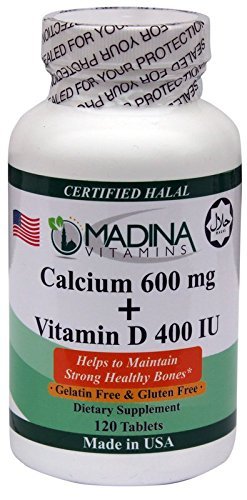 A bottle of Madina Calcium + Vitamin D 400 IU supplement with a white label featuring a green leaf logo, a certified halal symbol, and a white and green color scheme. The label also includes a warning about potential side effects and a statement about the product being made in the USA. The bottle is filled with a white powder and has a green cap. | Halal Calcium 600mg + Vitamin D3 400 IU – Made in USA by Madina Halal Vitamins | c5a9cdae8aae9486ed99d16a54f3045bc1924d2f8a456bc44169832660f13181 | 001229746384 | 0 | 0 | 65 | 16 | 0 | 0 | |