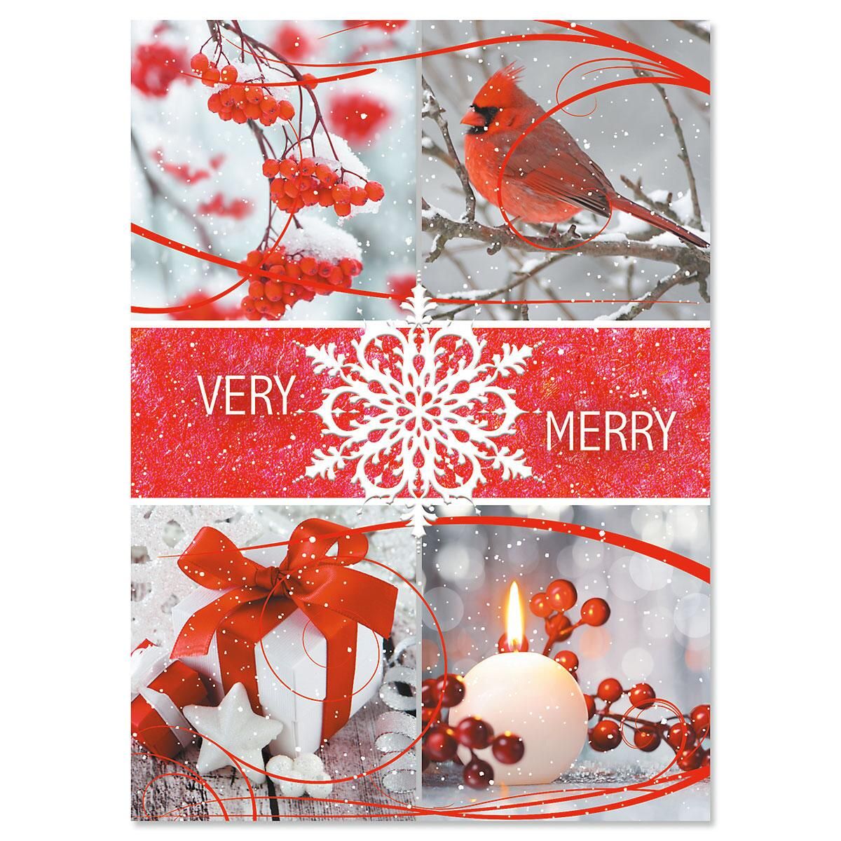 A festive holiday-themed image with a red background featuring a snowflake design. The image is divided into four sections, each with a different winter scene. The top left section shows a branch with red berries and a red cardinal bird. The top right section displays a branch with red berries and a red cardinal bird, similar to the top left section. The bottom left section features a red bow, a white snow globe, and a lit candle surrounded by red berries. The bottom right section shows a red bow, a white snow globe, and a lit candle surrounded by red berries, similar to the bottom left section. The word 'VERY' is | Holiday Collage Personalized Christmas Cards - Set of 18 | 3fb29189360ae56f53f5129a34bcd382283998e69c441a27605857da48b3be8e | 001229746495 | 0 | 0 | 111 | 9 | 0 | 0 | |