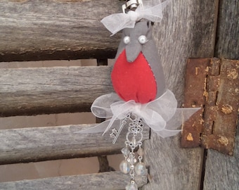 A gray plush toy bird with a red heart on its chest is hanging from a wooden fence. The bird has a white bow around its neck and is attached to a chain with a charm and a crystal pendant. | bag in red and grey shabby charm. | 9bff7f949fc9125024ef9afd15b18f1b79ed086a3d20861eee9bb1713e99a587 | 001229746488 | 0 | 0 | 40 | 7 | 0 | 0 | |