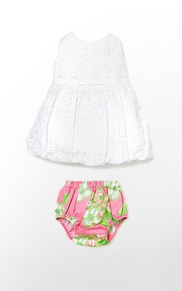 A white baby outfit with a floral pattern on the shorts is displayed against a white background. | Lilly Pulitzer Britta Baby Bubble Dress | 33072d099b26acbe51b2bb7553379f1ce636b9fd40b289caa290f624e6f3ee6e | 001229746467 | 0 | 0 | 17 | 6 | 0 | 0 | |