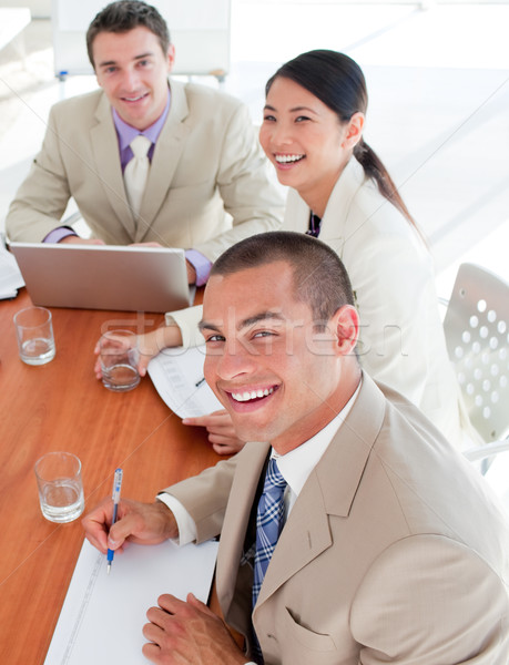 A group of three people is sitting around a wooden table in a conference room. The person on the left is a man with short hair, wearing a light-colored suit and a tie, smiling and looking at the camera. The person in the middle is a woman with long hair, also wearing a light-colored suit and smiling. The person on the right is a man with a short buzz cut, wearing a light-colored suit and a tie, and is also smiling. On the table, there are two laptops, a notepad, a pen, a glass of water, and a cup. The room has a modern design with a large window | Confident business people in a meeting Stock photo \xc2\xa9 wavebreak_media | 3a53212487b86c435aaa0a3e818fd603ab964817f9f31e9241eac3249578dcec | 001229746393 | 0 | 0 | 109 | 10 | 0 | 0 | |