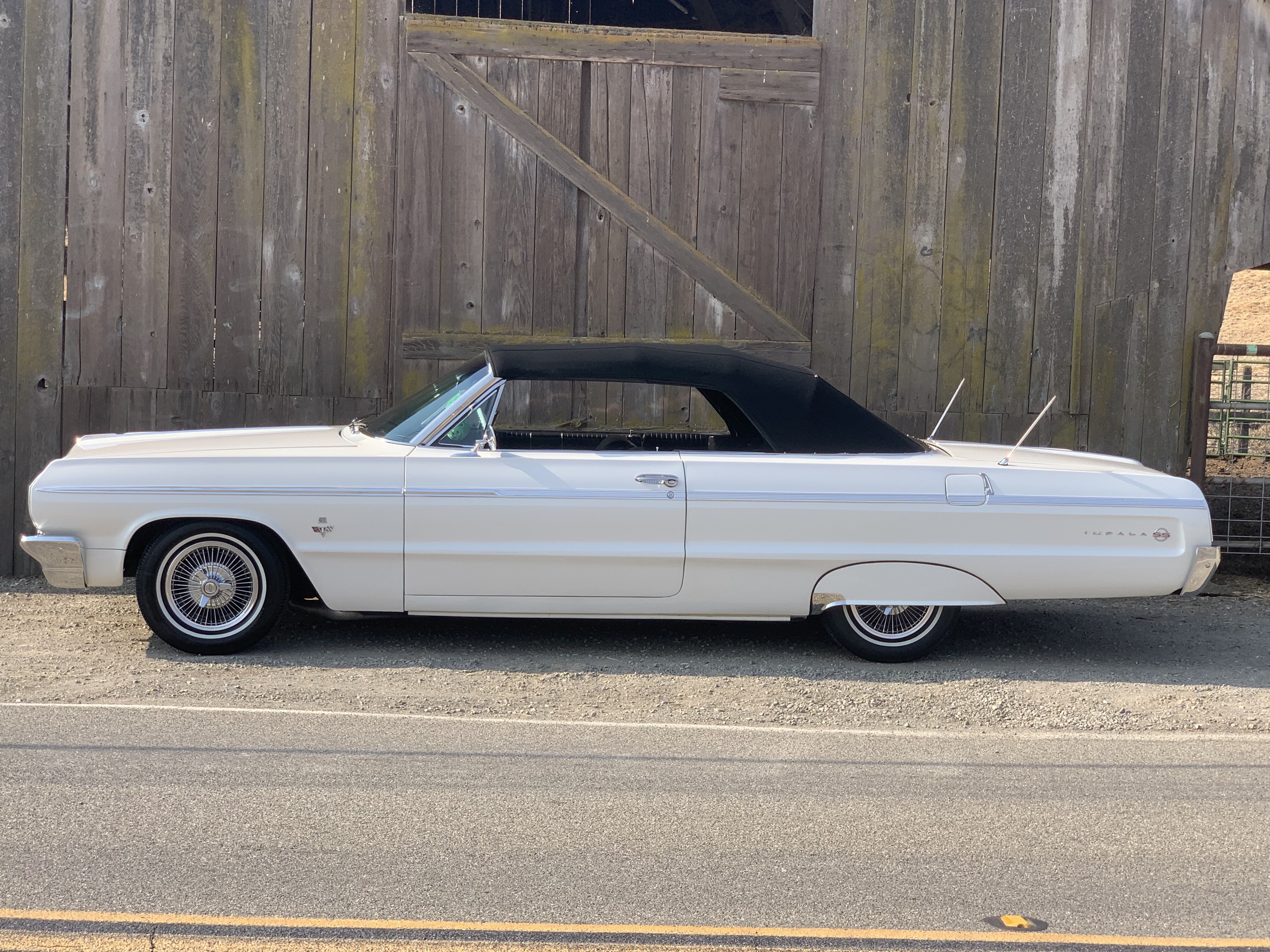 A white vintage car with a black top is parked on the side of a road next to a wooden fence and a barn. | 1964 Chevrolet Impala Convertible for sale 101375290 | 59498103d3bc5e9b4af4f7501c60b2f6d4de7e20a2a984b650a202619f71d350 | 001229720076 | 0 | 0 | 24 | 7 | 0 | 0 | |
