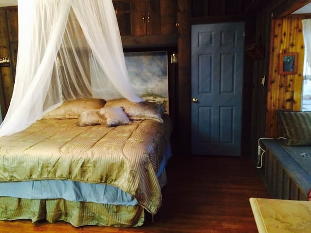 The first image shows a bedroom with a large bed covered in a gold and beige bedspread. The bed is adorned with multiple pillows and a white canopy with sheer curtains. The room has wooden walls and flooring, and there is a blue door with a gold doorknob. To the right of the bed, there is a wooden chair with a cushion, and a wooden table with a vase on it. The room has a cozy and warm ambiance. | Epona Place ~ The Chelsea Room - Dunnellon - Bed & Breakfast | cbfa2bb676c4751ff031934f614daf3a10a347da5d7caed5e5d381840fb8f96a | 001229747034 | 0 | 0 | 79 | 12 | 0 | 0 | |