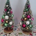 Two identical miniature Christmas trees with a dense arrangement of colorful ornaments and a green and red color scheme are placed on a wooden base on a table with a patterned tablecloth. | Vintage Bottle Brush Trees 9" Fully Decorated | 9b3d57e021bda73cf9c974b02a14360ceec4a34424f19cc1e42c734c9d7e7e50 | 001229747172 | 0 | 0 | 32 | 7 | 0 | 0 | |