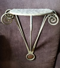 A vintage wooden table with a round, ornate metal base featuring a spiral design on each leg and a circular metal plate with a brown center on the underside of the table. | Decorative Metal Hanging Wall Shelf | bb5abc1ba332974f371546c2f7f7b93c2003dd1ae8a1066c6d2a94a0fc598185 | 001229747277 | 0 | 0 | 32 | 5 | 0 | 0 | |