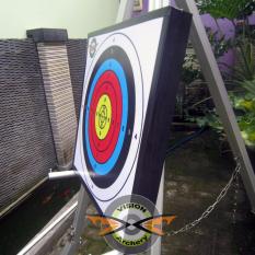 A target practice setup with a large, round, white target board featuring a bullseye design with concentric circles and a red center. The board is mounted on a wooden stand with a metal chain securing it. The target is set against a backdrop of a green wall and a window with a view of a pond and a fence. The scene is outdoors, and there is a hint of a plant in the upper right corner. | Diskon Bantalan Face Target 40X40X5Cm Bergaransi Bantal Karet Sasaran Arrow Busur Anak Panah Panahan Branded | 7365603a27ec21cc9c81ea7c48c25bf355657cf2b5794969066cf7a669bce386 | 001229747198 | 0 | 0 | 76 | 15 | 0 | 0 | |