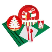 A festive holiday-themed dinner setting is displayed on a white background. The setting includes a red plate with a Christmas tree design and a red fork and spoon with green handles. There is also a red cup with a Christmas tree design, a green napkin, and a green placemat. The plate, cup, and napkin are adorned with red and green stripes and Christmas tree motifs. | Reindeer Christmas Party Party Pack, Multicolored | 995fc72ab2cbc1e79add2695fa7de14b311381878461e3292508baa20b4822f1 | 001229747292 | 0 | 0 | 65 | 6 | 0 | 0 | |