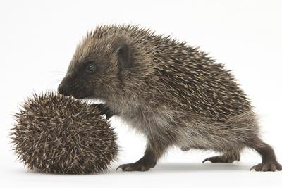 A hedgehog with a spiky brown and black body is standing on a white background. The hedgehog has a pointed snout, small eyes, and its spines are raised. It is holding a small, round, spiky brown object in its front paws. | Two Young Hedgehogs (Erinaceus Europaeus) One Standing, One Rolled into a Ball | 03a269a9d5583ae173400803e88c668ced451a9aa72ed516fa7208314f165168 | 001229747327 | 0 | 0 | 41 | 12 | 0 | 0 | |