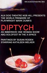 The second image is a promotional poster for a theatrical performance called 'Dipych'. It features a stylized image of a plate with two cherries on it, with the word 'Dipych' prominently displayed above it. The poster includes text announcing the performance, stating that it is an immersive one-woman show, and that it is presented by 'Aux Dog Theatre' and 'The World Premiere of Playwright Mark Dunn's'. The poster also includes the names of the performers and the director, as well as a tagline that reads 'An intimate solo performance in the X-Space'. The overall design is dark and moody | Diptych at ABQ SOLO Fest 2019 | 00277df8d9af267b0c529f8d03a5fc8647db0bced518a201c0cf071123a63444 | 001229720218 | 0 | 0 | 99 | 6 | 0 | 0 | |