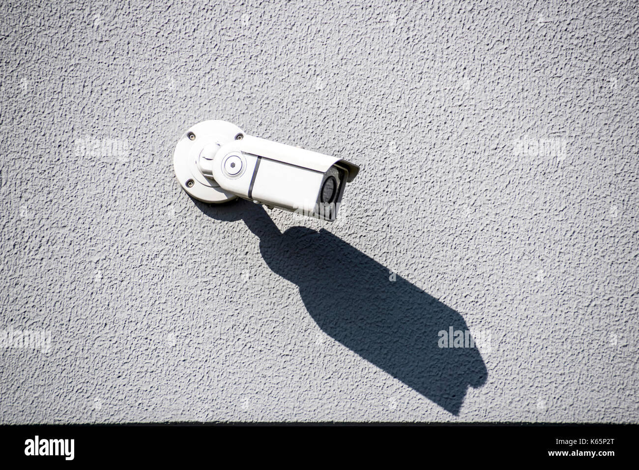 A security camera is mounted on a wall with a shadow cast on the wall below it. The camera is white with a circular lens and a small white speaker on the side. The wall has a textured surface with a pattern of small, round, white dots. The shadow is elongated and symmetrical, indicating a light source from the left. The image has a watermark in the bottom right corner that reads 'ALAMY' with a logo and copyright information. | Security Camera - Stock Image | 9038fc04045cb3fc721989d666e65073bc98057fcb59ab77689670991f56a881 | 001229748019 | 0 | 0 | 79 | 5 | 0 | 0 | |