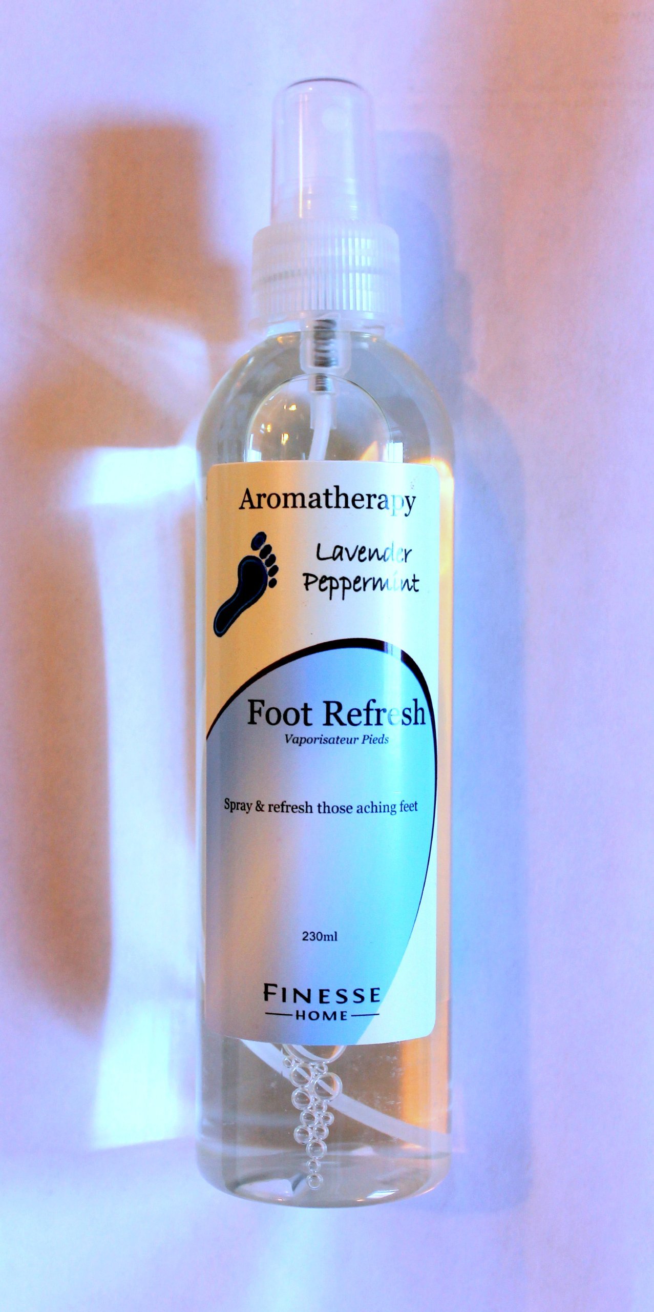 A clear plastic bottle with a white cap is filled with a clear liquid. The label on the bottle has a black and white design with the words 'AROMATHERAPY FOOT REFRESH' and 'PEPPERMINT' in black, and the word 'FINESESE' in white. The label also features a black foot print icon and a black and white illustration of a peppermint leaf. The bottle is placed on a white surface, and there is a shadow cast to the left of the bottle. | Finesse - Foot Refresh Spray. Aromatherapy. Lavender Peppermint by Finesse | 96bce3f564580076cb5ab0b4ef1a0343318dc6082c43bc20bf982b00723d08e4 | 001229748047 | 0 | 0 | 80 | 10 | 0 | 0 | |