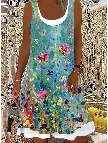 A woman is wearing a sleeveless dress with a floral pattern that resembles a painting. The dress has a white collar and a white hem at the bottom. She is standing in front of a patterned background that complements the dress. | Women\\'s Shift Dress Floral Dress Short Mini Dress Green Sleeveless Floral Print Print Spring Summer U Neck Casual 2022 S M L XL XXL 3XL / Casual Dress | 6ef0812759ba109d9ac31914e8ea60f391be18b6ea612e32dba86ddc1d19a726 | 001229748102 | 0 | 0 | 41 | 28 | 0 | 0 | |