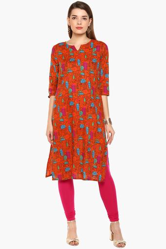 A woman is wearing a vibrant orange dress with a pattern of blue and green geometric shapes, paired with pink leggings. She has a gold watch on her left wrist and is wearing gold earrings. Her hair is styled in a bun, and she is wearing beige high heels. | Womens Notched Neck Printed Kurta | 503d5761203884ca26b4e97ab0982bfda572973c6e18d6e4a645f5011de5f7dd | 001229748017 | 0 | 0 | 49 | 5 | 0 | 0 | |
