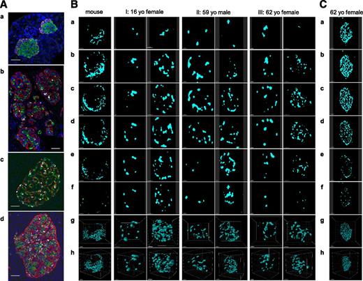 The second image is a detailed illustration of a microscope slide with various stages of cell division. The slide is divided into sections, each representing a different stage of the process. The cells are depicted with a high level of detail, showing the chromosomes and other cellular structures. The image is labeled with letters and numbers, indicating the different stages of cell division, and is presented in a scientific format. | Figure 4. No subunit formation of the mantle-core arrangement in the human islet. A: 2D images of islets immunostained for insulin (green), glucagon (red), and somatostatin (white). (a) Mouse islets. Scale bar: 50 \xce\xbcm. (b) Human islets of various sizes. Scale bar: 50 \xce\xbcm. (c) Large islet. Scale bar: 50 \xce\xbcm. (d) Large islets. Scale bar: 100 \xce\xbcm. B: \xce\xb1-Cell distribution in mouse islets (8-week-old C57BL/6J) and human islets from three different donors (I: 16-year-old [yo] girl, II: 59-year-old man, III: 62-year-old woman). (a\xe2\x80\x93f) Serial optical z-slices from top to bottom of the islet. Fluorescent signal for glucagon after binary conversion is shown. Front view (g) and side view (h) of 3D-rendered \xce\xb1-cells. Scale bar: 50 \xce\xbcm for mouse in a\xe2\x80\x93f, 30 \xce\xbcm for mouse in g and h, all 30 \xce\xbcm for I except 20 \xce\xbcm for g, and all 20 \xce\xbcm for II and III. Scale bars: 30 \xce\xbcm for I except 50 \xce\xbcm for g and h, all 50 \xce\xbcm for II, and 20 \xce\xbcm for III except 40 \xce\xbcm for g and h. C: Serial z-slices of a large islet depicting glucagon signal from top to bottom and 3D rendering. (a\xe2\x80\x93f) Top to bottom serial z-slices of islet showing binary converted fluorescence. (g) Front view of 3D-rendered \xce\xb1-cells. (h) Side view of g. Scale bar: 80 \xce\xbcm for a\xe2\x80\x93f, 70 \xce\xbcm for g, and 100 \xce\xbcm for h. See also Supplementary Figs. 1\xe2\x80\x934 and Supplementary Movies 1\xe2\x80\x937. | a8bfacdfdd8fe519814d426a5141a0bf42de26c20252053492b9a69b4893cd62 | 001229748291 | 0 | 0 | 70 | 241 | 0 | 0 | |