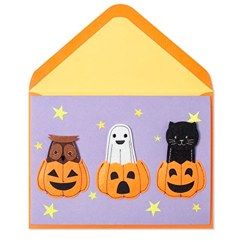 A Halloween-themed greeting card with a purple background featuring a ghost, a black cat, and three pumpkins. The card has a yellow envelope flap on the top left corner. The ghost is in the center, with a smiling face and a white body. To the left of the ghost is a brown owl with a white face and a black cat to the right. Below the ghost are three pumpkins with different expressions: a smiling pumpkin, a frowning pumpkin, and a pumpkin with a surprised expression. The pumpkins are surrounded by yellow stars and purple sparkles. | Halloween Paper Finger Puppets (PAPYRUS Costumes For Your Fingers, 1) | 685ee8112c5bede8e22dc6ceab2aece2c9b74de628cf8b1ad523ecd142bdde47 | 001229748338 | 0 | 0 | 96 | 10 | 0 | 0 | |