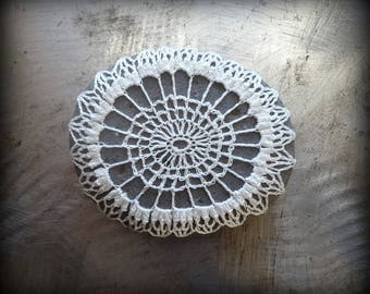 A close-up image of a white crochet doily with intricate patterns, placed on a textured surface with a soft, diffused light illuminating it from the upper left corner. | Crocheted Stone, Handmade One of a Kind Unique Decorative Doily Gift, White, Gray, Bohemian, Small, Miniature Art, Collectible, Monicaj | 05a6e868260bad0d81796166d8edded8e566e35106e40bbf38198a8627f6eecb | 001229748414 | 0 | 0 | 28 | 19 | 0 | 0 | |