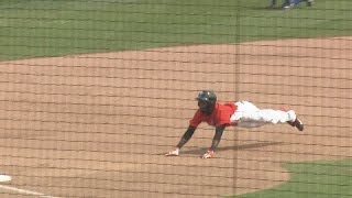 A baseball player is sliding into a base on a field. The player is wearing a red and white uniform with a helmet. The field has a dirt area with a grassy border, and there is a chain-link fence in the background. The player's body is stretched out, with one leg extended behind and the other in front, and the arms are outstretched for balance. | Tides offense clicks in 6-3 win over Bulls | dde110f02367c569f23e14b3bb3bda95b722a9d2523614b15878d31f7475a97e | 001229748657 | 0 | 0 | 65 | 8 | 0 | 0 | |