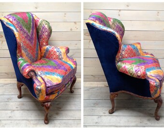 A vibrant, multicolored armchair with a patterned fabric is displayed against a wooden wall. The chair has a high backrest with a tufted design, a plush seat cushion, and ornate wooden legs. | Wingback Armchair Upholstered in Antique Sari | bd8e3217fd93168e1ed45b57a1516614c7dce9001af67ca301d6b291287cf828 | 001229748709 | 0 | 0 | 32 | 6 | 0 | 0 | |