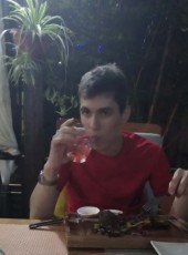 A man in a red shirt is sitting at a dining table with a plate of food in front of him. He is holding a glass of red liquid, possibly a cocktail, and appears to be taking a sip. The table is set with a fork, knife, and a bowl. There is a potted plant on the left side of the image, and the background is dark, suggesting it might be evening or night time. | Artem, 24, Uzbekistan, Tashkent | 7a974af95e39a272534c5ea791f30c1b58af3d35d0e26908a291440fb3c88e1d | 001229748573 | 0 | 0 | 75 | 4 | 0 | 0 | |