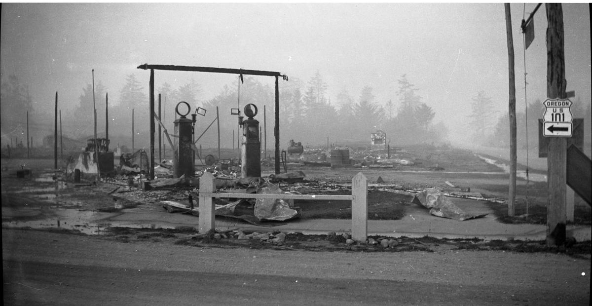 A black and white photograph depicts a desolate scene with a row of fire hydrants, some of which are damaged and appear to be on fire. The ground is covered in debris, and there is a wooden fence in the foreground. The background shows a forest shrouded in fog, and the sky is overcast. A street sign is visible on the right side of the image. | Bandon Fire of 1936 | 2e2d6e2fe657c089ca41465440fe2897abde456e8e9a289484f1463888f58a78 | 001229748801 | 0 | 0 | 66 | 4 | 0 | 0 | |