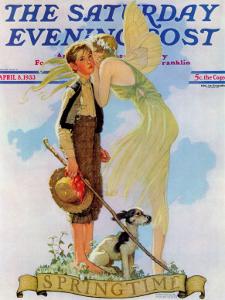 A vintage-style illustration of a young boy and a fairy standing together, with the boy holding a hat and a stick, and the fairy holding a flower. They are surrounded by a whimsical landscape with a dog, a bird, and a butterfly. The image is framed with a decorative border and the title 'The Saturday Evening Post' is visible at the top. | "Springtime, 1933" Saturday Evening Post Cover, April 8,1933 by Norman Rockwell | 355a7f19f0fbb0ec0c338e3cdbb5a18e58049a6c9f6344952f958cfa9a9cbbaf | 001229748761 | 0 | 0 | 62 | 11 | 0 | 0 | |